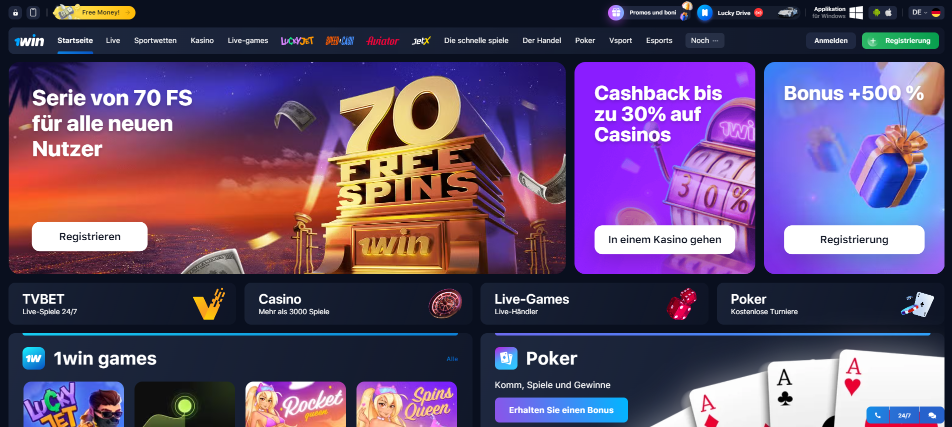 Viele deutsche Benutzer möchten versuchen, den Jackpot im 1win Pokerraum und in schnellen Spielen zu gewinnen. Diese Bereiche wachsen weniger aktiv als der Slot-Bereich. Gleichzeitig verfügen sie über ein eigenes Publikum, das sich bei Wetten aktiv manifestiert. In der Lobby finden Sie einige Crash-Maschinen. In ihnen müssen Sie den wachsenden Koeffizienten überwachen und rechtzeitig Geld abheben. Es erscheinen auch Geräte wie Plinko und andere Genres. Um Ihnen die Auswahl der Unterhaltung zu erleichtern, können Sie die besten Slots im folgenden Abschnitt überprüfen: