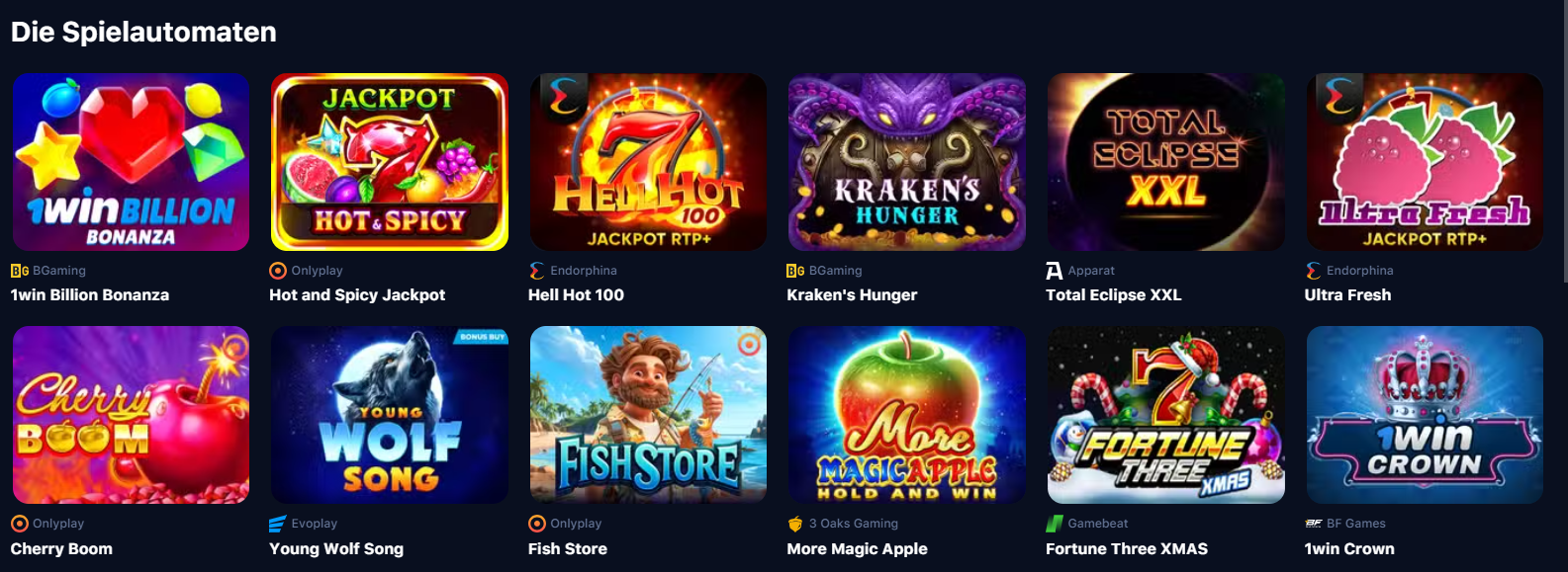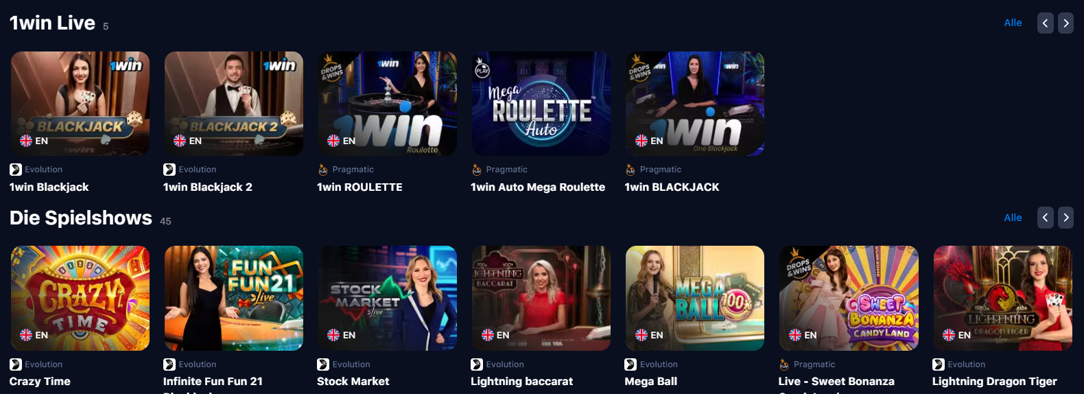 Ein gutes Zeichen für das 1Win Casino in Deutschland wird die Präsenz einer großen Auswahl an Anbietern sein. Entwickler mit unterschiedlichen Erfahrungen und aus der ganzen Welt bieten hochwertige Spielautomaten unterschiedlicher Genres an. Dabei handelt es sich hauptsächlich um klassische Slots, aber auch Live-Dealer-, Fast- und andere Spiele sind verfügbar. Gehen Sie unbedingt ins Suchmenü und wählen Sie einen der Top-Hersteller aus: