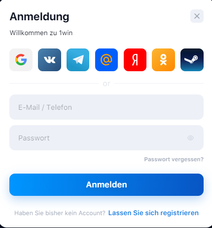 Viele Leute fragen, wie man Einloggen in 1Win am bequemsten durchführt . Es gibt zwei Hauptmethoden für die schnelle Autorisierung auf der Website. Die erste Möglichkeit ist die Ein-Klick-Anmeldung über soziale Netzwerke. Bitte beachten Sie, dass der Teilnehmer die gleiche Seite wie bei der Anmeldung nutzen muss. Sie können sich auch anmelden, indem Sie ein Formular ausfüllen. Dafür reicht es: