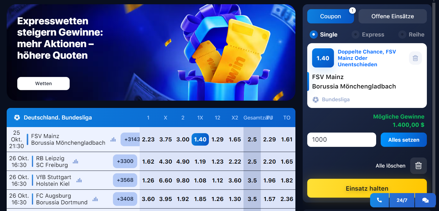 Einer der Vorteile für Spieler aus Deutschland war die Werbepolitik der Website. Die Chance, einen 1Win-Bonus zu erhalten, entsteht bei der Registrierung, der Einzahlung auf Ihr Guthaben, der Aktivierung verschiedener Codes und Coupons. Wenn die Bedingungen der Aktion unklar sind, können Sie sie im entsprechenden Abschnitt der Website nachlesen. Es besteht auch die Möglichkeit, den Support rund um die Uhr zu kontaktieren. Sie können sich ganz einfach über den Werbebereich der Benutzeroberfläche über neue Veranstaltungen informieren oder den Newsletter abonnieren. Einige exklusive Boni werden direkt in den sozialen Netzwerken des Unternehmens veröffentlicht.